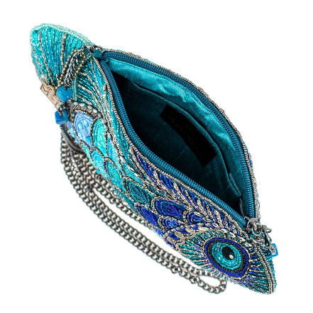The result is a wearable work of art that effortlessly combines glamour with a touch of whimsy. Dimensions: 10.75 x 1 x 7.25", Strap length - 49", Strap drop - 22.5", Removable beaded crossbody chain strap, Zipper closure, Inside slip pocket, Aqua lining, Fits a cell phone
